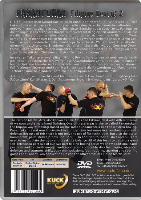 In part two of our two part filipino boxing series we show additional hand positions and footwork, empty hands applications of double stick techniques, advanced defenses and counters, drills, body manipulations, foot trapping, sparring and sparring games and Panantukan applications inside the other areas of Filipino Martial Arts.
